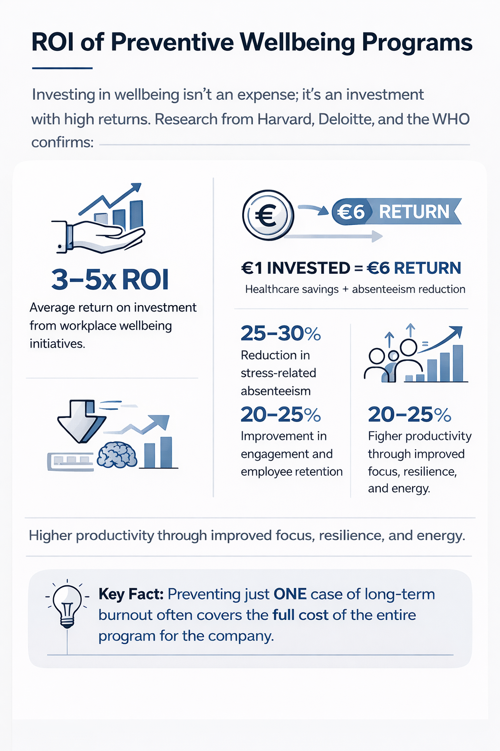 Investing in wellbeing isn't an expense; it's an investment with high returns. Research from Harvard, Deloitte, and the WHO confirms: